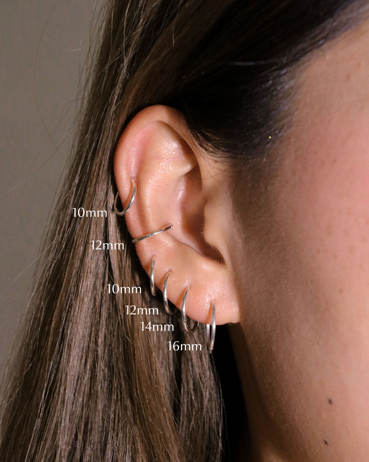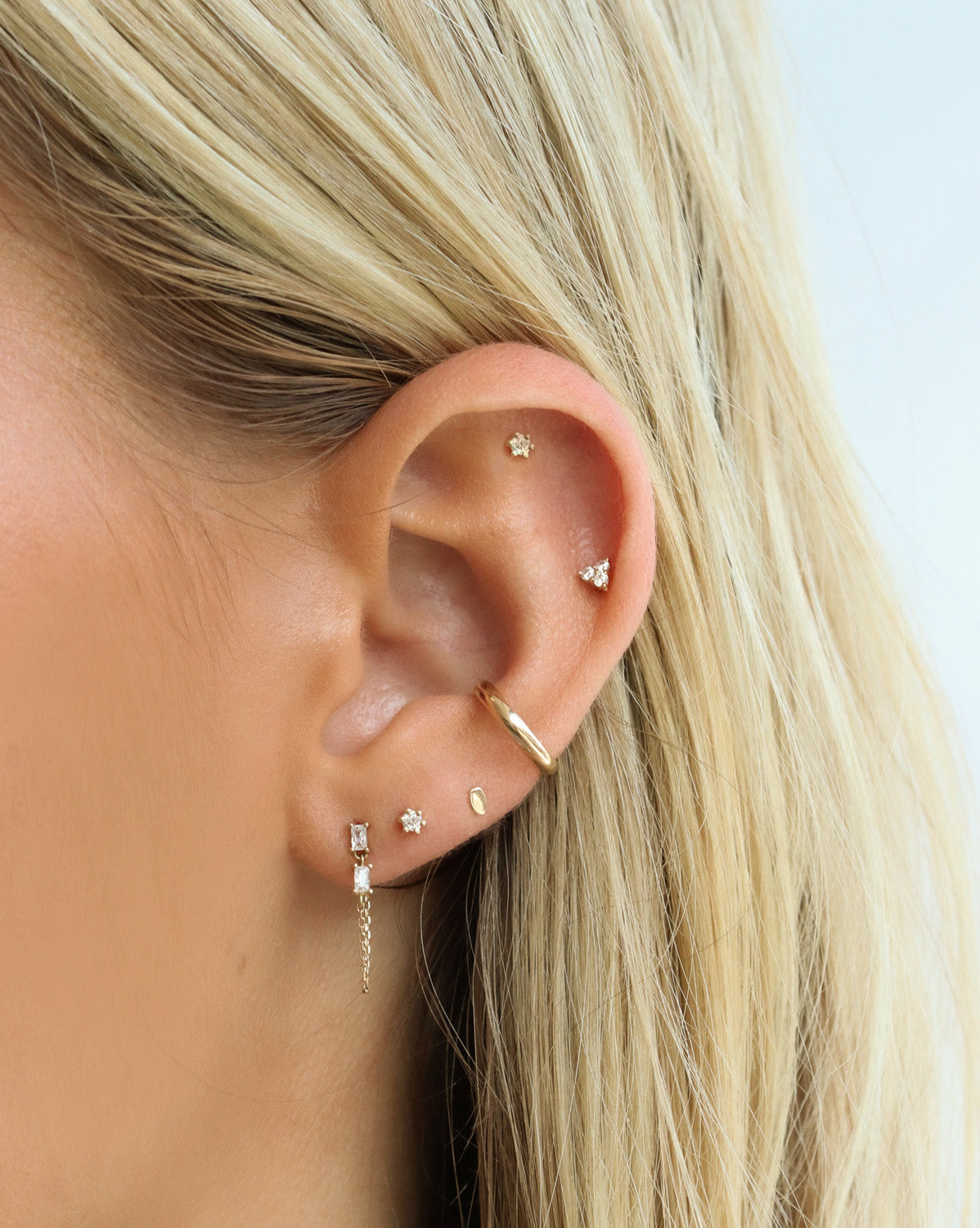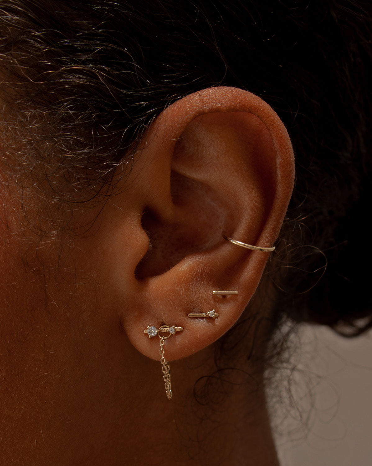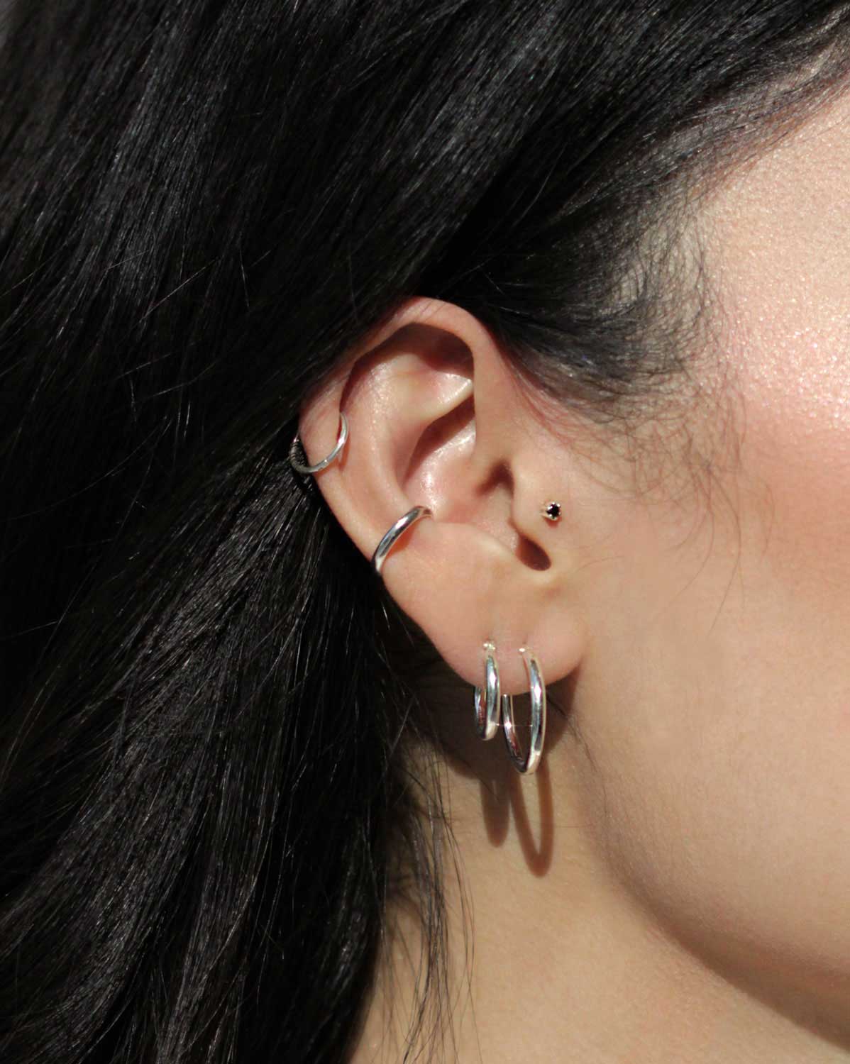 Ear Cuff: Ear cuffs are half circle ear accessories that can be slotted onto the edge of your ear without the need for passing through a piercing. They are designed to be worn in the middle part of the ear where there is a deeper ridge for the piece to be secured.